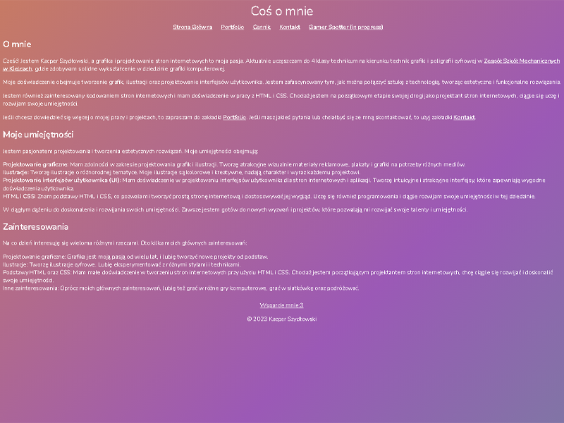 Hejka jestem Kacper znany również jako Dotmn. Mam 19lat(06 rocznik) i chodzę do 4 klasy ZSM w Kielcach na technika grafiki i poligrafii cyfrowej a bardziej po polskiemu to na grafiku. Ogólnie to lubie tworzyć grafikę komputerową oraz projektowanie stron internetowych. Oprócz tego lubię również spędzać czas na gierkach. Jak chcesz zagrać w coś pisz najlepiej dc albo ig.